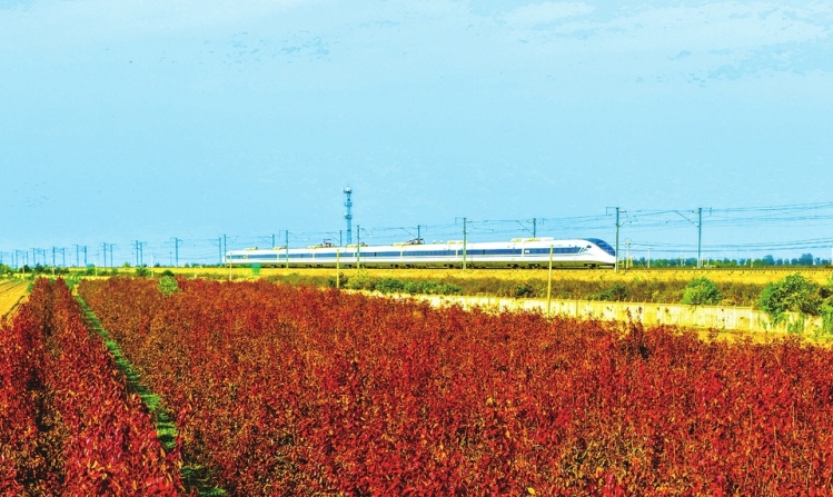 11月9日,永济市田野间,一列动车组疾驰在大西高铁线上,与湛蓝的天空、成片的红叶相映成景,宛如一幅诗意画卷铺展于大地。(程永仁摄)