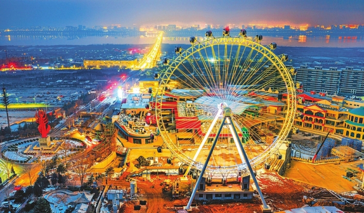 1月23日晚,运城盐湖·活力山谷度假区项目现场,摩天轮的闪烁灯光与川流不息的车流相映成景。该项目已进入收尾阶段,整体轮廓愈发清晰,施工人员与机械加紧作业,保障项目早日完工,为运城文旅产业注入全新活力。(薛俊摄)